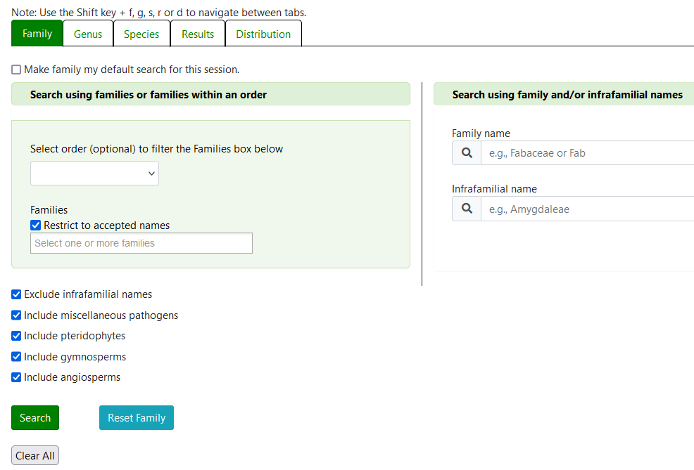 The right-side requires text to be entered into the family and/or infrafamilial search box. The infrafamilial search is a new feature.